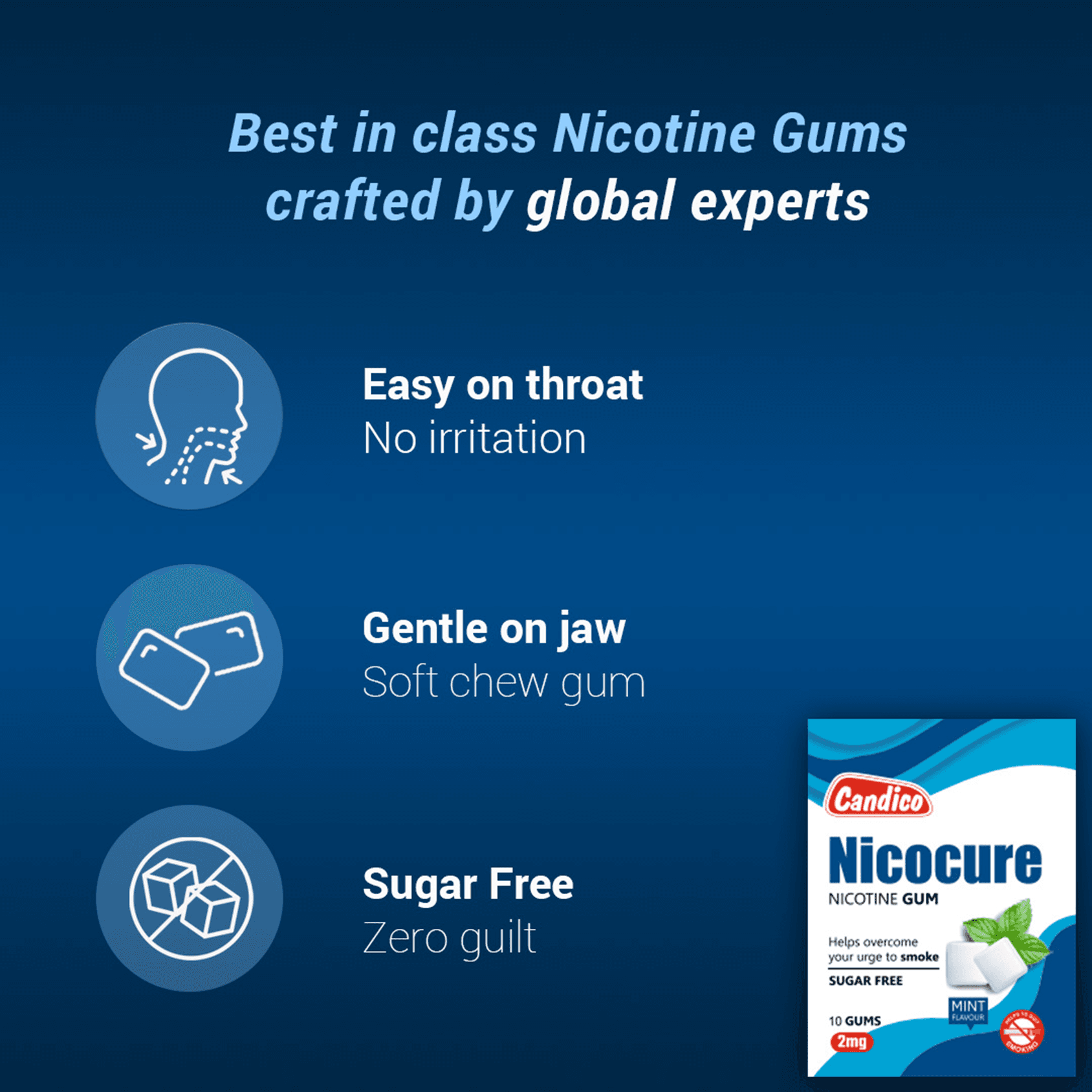 Nicocure Nicotine Gum helps manage cravings, reduces irritability and restlessness, and provides on-demand support during moments of urge. Its discreet, chewable format allows flexible use throughout the day.